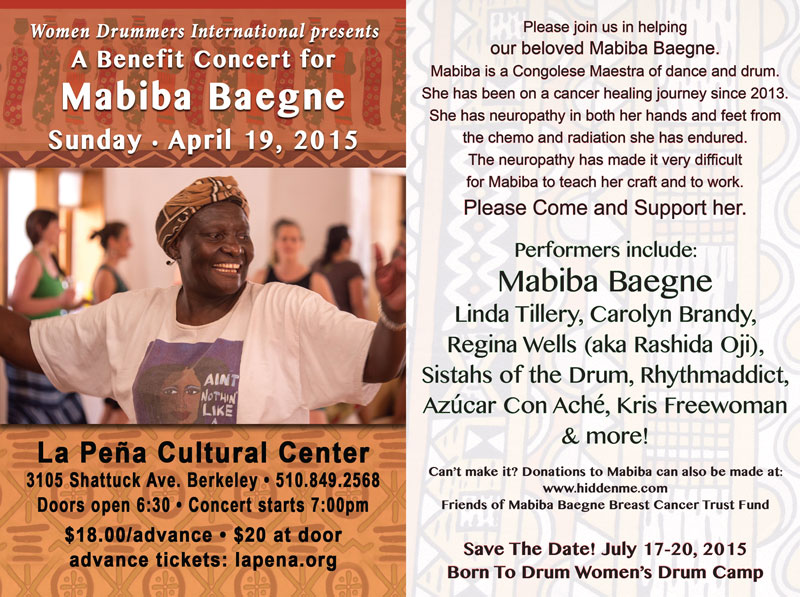 Mabiba Baegne, Linda Tillery, Carolyn Brandy, Regina Wells (aka Rashida Oji), Sistahs of the Drum, RhythmAddicts (featuring Wade Peterson, Ben Isaacs, Gabe Harris and many others) Azucar con Aché, Kris Freewoman and MORE!